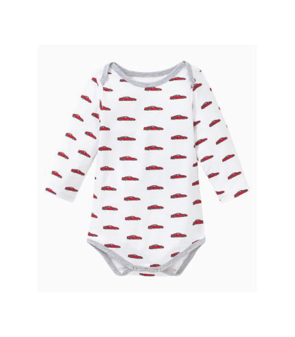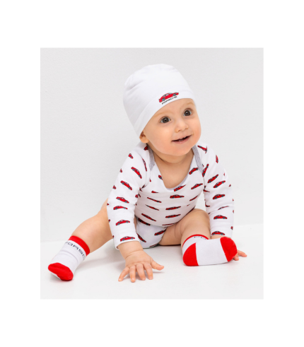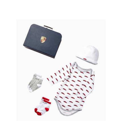 En el interior del set se encuentran piezas cuidadosamente seleccionadas, que incluyen un body y un gorro, ambos decorados con vehículos Porsche, así como dos pares de calcetines que completan el conjunto.